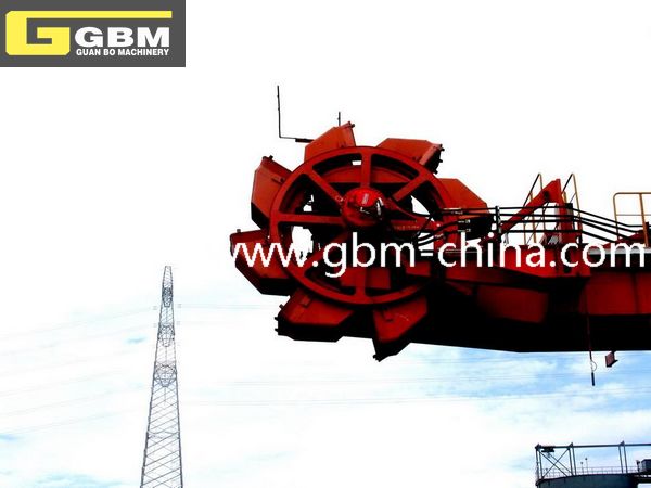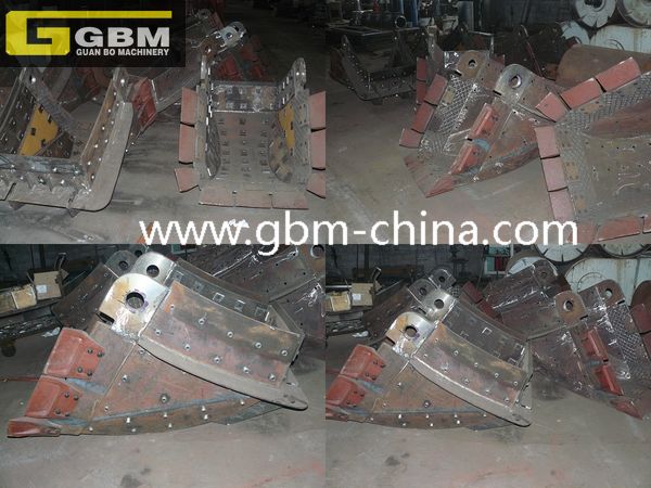 斗輪轉(zhuǎn)動裝置安裝于前臂架的端部,為了堆取和卸料方便,安裝時斗輪在垂直面內(nèi)頃角 10° 。它由 9 個斗子、斗輪體、溜料板、支撐軸承 (3003156) 、斗輪軸、 ZHP5.31-K 圓柱行星減速器, YOXA500 液力偶合器、電動機及軸承座和電機支撐、斗輪軸潤滑系統(tǒng)等組成。 ZHP5.34—K 減速器由圓錐齒輪箱加行星齒輪箱組合的減速器,總傳動比 i=217.28 ,箱內(nèi)加 BPEnercynSG-XP22D 齒輪油,加至油標(biāo)頂部位置約 65 ~ 70L 。冬季用低粘度;夏季用高粘度齒輪油。減速器出軸為空心軸通過鎖緊盤套掛在斗輪軸上,電動機支撐通過扭矩桿系鉸接在前臂架上。 斗輪的結(jié)構(gòu)型式為無格式,這樣即保證斗輪體有良好的強度,又可使卸料塊、回料少,比有格式斗輪出力大。溜料板的正確安裝,并使其與斗輪體合理貼合是減少漏料的重要措施,要使固定不動的圓弧擋料板與回轉(zhuǎn)的斗輪體之間安裝間隙調(diào)整到進入處為3mm ,離去處為 5mm ,不宜過大,否則易夾料發(fā)生故障。斗輪軸與減速器或斗輪體的連接分別采用帶有錐形體套的鎖緊盤和脹套聯(lián)接。