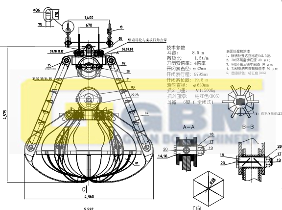 四索多瓣抓斗是一種能在各種惡劣環(huán)境下從事礦石、廢鋼、鎳礦、生活垃圾、木片等散貨裝卸的有效工具。對(duì)一些鵝卵石比較多的河道,還可用于河道疏浚。抓斗結(jié)構(gòu)簡(jiǎn)單,操作方便,能在各種狀態(tài)下準(zhǔn)確地完成啟閉動(dòng)作。抓斗采用三維虛擬設(shè)計(jì),并采用ANSYS對(duì)抓斗主要零部件進(jìn)行強(qiáng)度分析及校核,自重分配更加合理,使用壽命更長(zhǎng)。抓斗適用于雙卷筒起重機(jī)裝卸散貨,抓斗上配有起重鏈可以直接與起重機(jī)起升繩連接,鋼絲繩頭部連接形式可以根據(jù)起重機(jī)要求定制。多瓣抓斗用于抓取大塊廢鋼或生活垃圾時(shí),為方便齒尖的插入,一般斗瓣設(shè)計(jì)成半開式。
