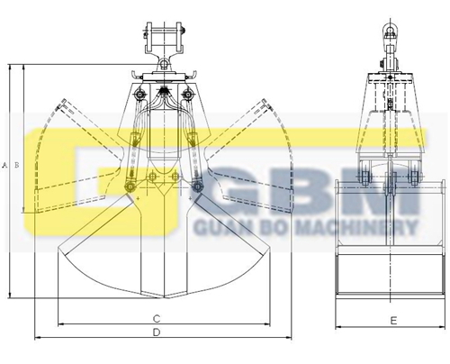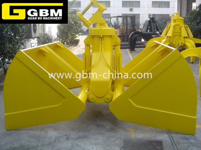 液壓雙瓣抓斗配挖掘機使用,本身無動力,依靠挖掘機提供的高壓液壓油作為動力。挖掘機引出一路高壓液壓油進入抓斗開閉系統,通過控制油缸伸出和縮回來控制抓斗的開閉;引出另一路高壓液壓油進入抓斗旋轉系統,通過控制液壓馬達的旋轉來控制抓斗旋轉。