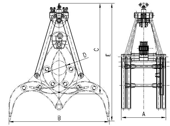 四索木材抓斗是為門機和各種橋式起重機配備裝卸木材的抓斗,具有結構合理、操作方便、操作安全的特點,不僅適用于港口,而且也是鐵路、木材加工、木材儲運等行業的理想裝卸工具。抓斗采用三維虛擬設計,并采用ANSYS軟件進行強度分析及校核,自重分配更加合理,使用壽命更長。抓斗適用于雙卷筒起重機裝卸各類原木,抓斗上承梁上配有可旋轉的平衡架并配有起重鏈,可以與起重機的起升繩卸扣直接連接。平衡架根據起重機滑輪排布的不同,可做成大平衡架(開閉繩在起升繩內側)或小平衡架(開閉繩在起升繩外側)。